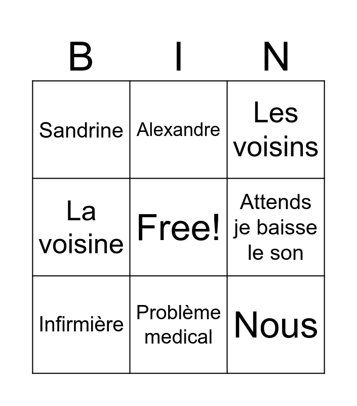 This bingo card has a free space and 8 words: Attends je baisse le son, Les voisins, Alexandre, Infirmière, Sandrine, Nous, La voisine and Problème medical.