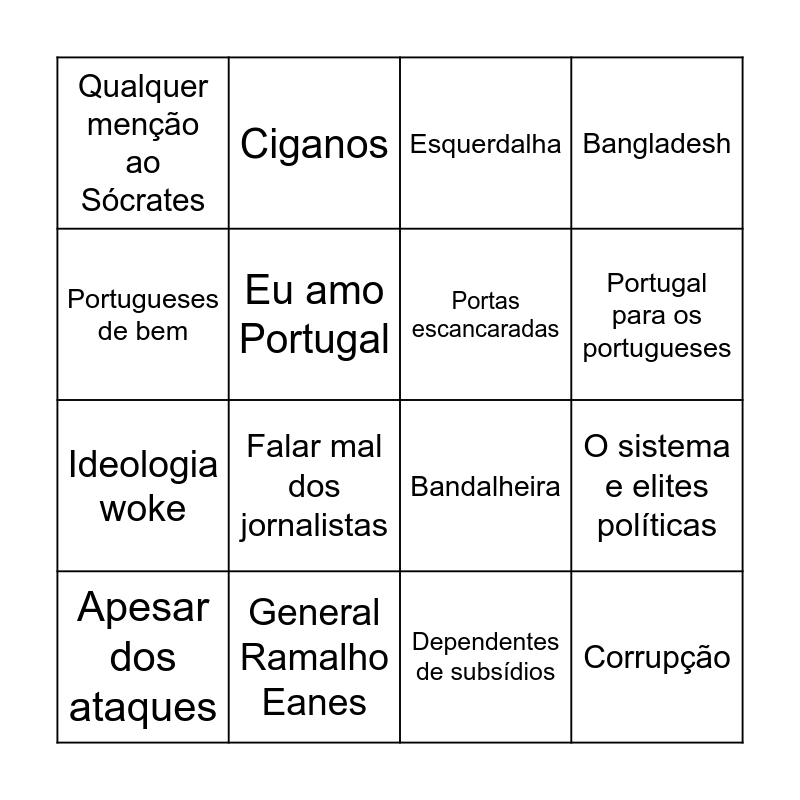 This bingo card has 16 words: Apesar dos ataques, General Ramalho Eanes, Esquerdalha, Bangladesh, Portugueses de bem, Ciganos, Bandalheira, O sistema e elites políticas, Qualquer menção ao Sócrates, Eu amo Portugal, Dependentes de subsídios, Portugal para os portugueses, Ideologia woke, Falar mal dos jornalistas, Portas escancaradas and Corrupção.