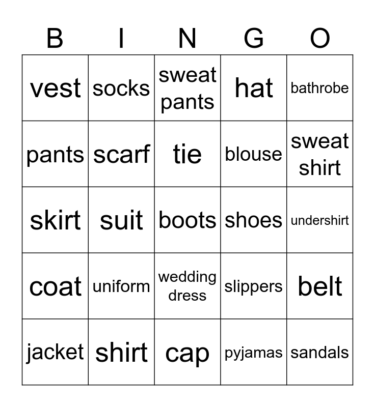 This bingo card has a free space and 24 words: uniform, shirt, tie, jacket, bathrobe, vest, pants, socks, shoes, wedding dress, blouse, skirt, slippers, belt, scarf, pyjamas, undershirt, sweat pants, sweat shirt, suit, sandals, coat, hat and cap.