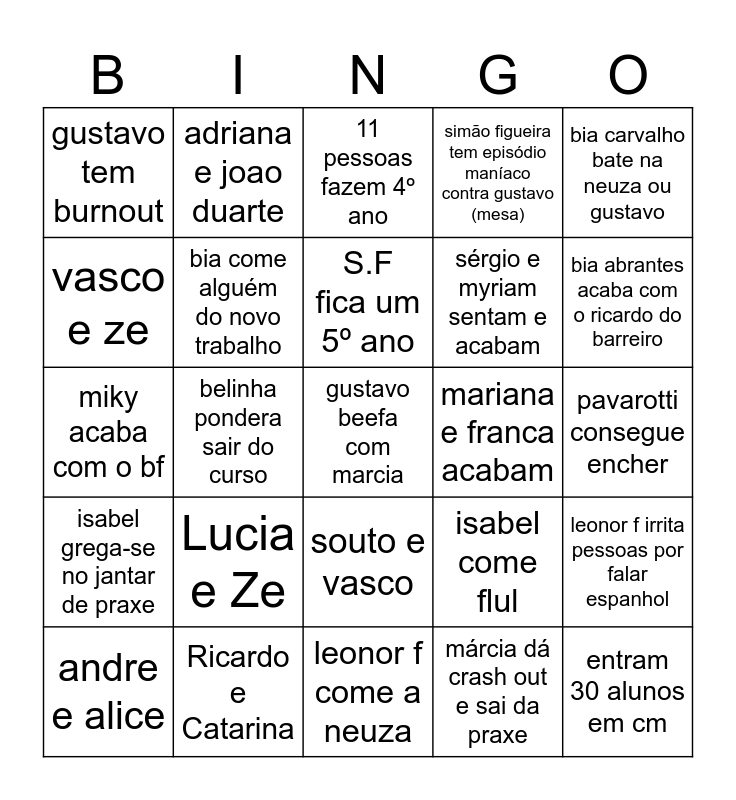 This bingo card has a free space and 24 words: Lucia e Ze, Ricardo e Catarina, S.F fica um 5º ano, andre e alice, bia carvalho bate na neuza ou gustavo, gustavo tem burnout, vasco e ze, adriana e joao duarte, mariana e franca acabam, souto e vasco, sérgio e myriam sentam e acabam, miky acaba com o bf, isabel come flul, leonor f irrita pessoas por falar espanhol, bia come alguém do novo trabalho, márcia dá crash out e sai da praxe, pavarotti consegue encher, 11 pessoas fazem 4º ano, bia abrantes acaba com o ricardo do barreiro, belinha pondera sair do curso, entram 30 alunos em cm, isabel grega-se no jantar de praxe, simão figueira tem episódio maníaco contra gustavo (mesa) and leonor f come a neuza.