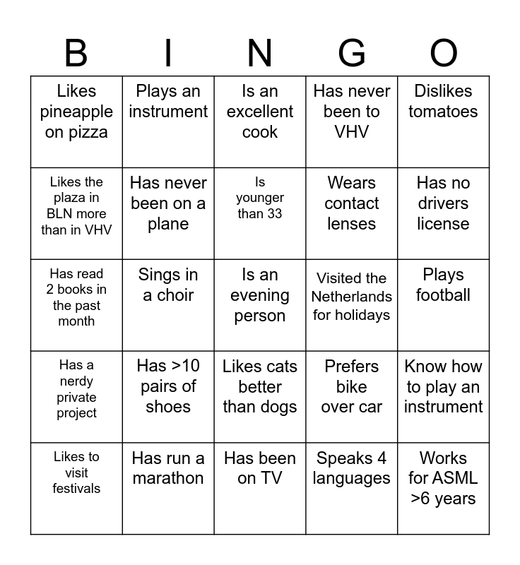 This bingo card has 25 words: Has >10 pairs of shoes, Has been on TV, Is younger than 33, Likes to visit festivals, Dislikes tomatoes, Likes pineapple on pizza, Likes the plaza in BLN more than in VHV, Plays an instrument, Visited the Netherlands for holidays, Likes cats better than dogs, Wears contact lenses, Has read 2 books in the past month, Prefers bike over car, Know how to play an instrument, Has never been on a plane, Works for ASML >6 years, Plays football, Is an excellent cook, Has no drivers license, Sings in a choir, Is an evening person, Has run a marathon, Has a nerdy private project, Has never been to VHV and Speaks 4 languages.