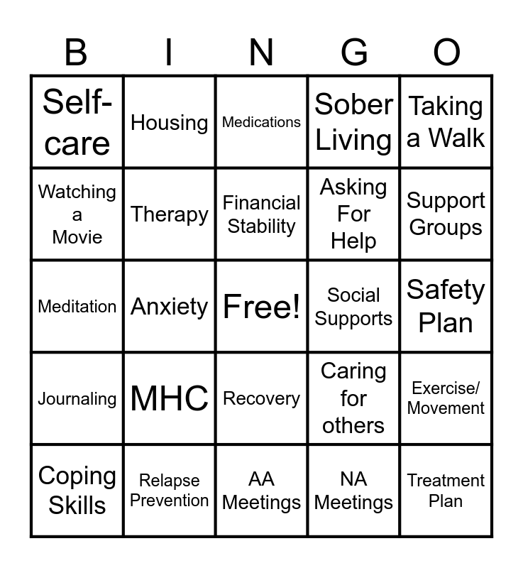 This bingo card has a free space and 29 words: Coping Skills, Warning Signs, Anxiety, Depression, Self-care, Medications, Therapy, MHC, Social Supports, Relapse Prevention, Safety Plan, Treatment Plan, AA Meetings, NA Meetings, Support Groups, Case Manager, Recovery, Journaling, Taking a Walk, Meditation, Caring for others, Rest & Relaxation, Asking For Help, Watching a Movie, Sober Living, Housing, Exercise/ Movement, Financial Stability and Mental Health.