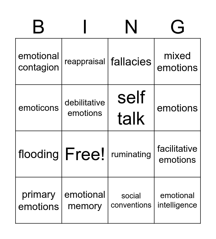This bingo card has 18 words: Free!, emotional intelligence, fallacies, emotional contagion, ruminating, mixed emotions, primary emotions, reappraisal, emotions, flooding, social conventions, emoticons, facilitative emotions, debilitative emotions, self talk, physiology, emotional memory and johari window.