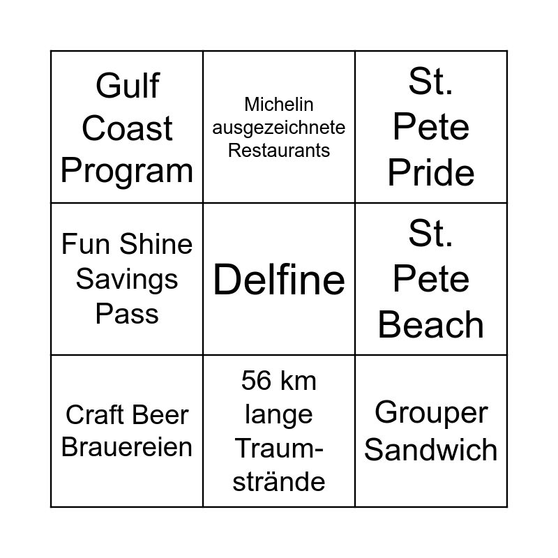This bingo card has 24 words: Dalí Museum, Clear-water Beach, 56 km lange Traum-strände, Dunedin, Delfine, Gulf Coast Program, St. Pete Beach, Michelin ausgezeichnete Restaurants, Tampa Bay International Airport, Murals, Grouper Sandwich, Die beliebtesten Strände der USA, St. Petersburg (“St. Pete”), Pier 60, Craft Beer Brauereien, Don Caesar Hotel, Chihuly Collection, St. Pete Pride, Manatees, Tarpon Springs, St. Pete City Pier, Gulfport, Fun Shine Savings Pass and Traumhafte Sonnen-untergänge.