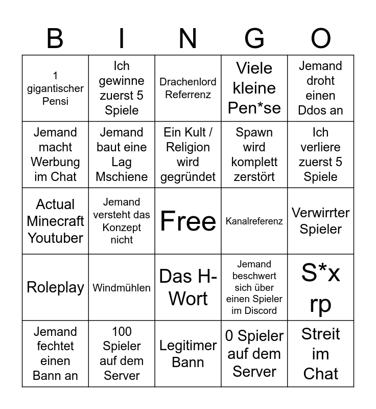 This bingo card has a free space and 24 words: Windmühlen, 100 Spieler auf dem Server, Ein Kult / Religion wird gegründet, Jemand fechtet einen Bann an, Jemand droht einen Ddos an, 1 gigantischer Pensi, Jemand macht Werbung im Chat, Ich gewinne zuerst 5 Spiele, Kanalreferenz, Das H-Wort, Spawn wird komplett zerstört, Actual Minecraft Youtuber, Jemand beschwert sich über einen Spieler im Discord, S*x rp, Jemand baut eine Lag Mschiene, 0 Spieler auf dem Server, Verwirrter Spieler, Drachenlord Referrenz, Ich verliere zuerst 5 Spiele, Jemand versteht das Konzept nicht, Streit im Chat, Roleplay, Viele kleine Pen*se and Legitimer Bann.