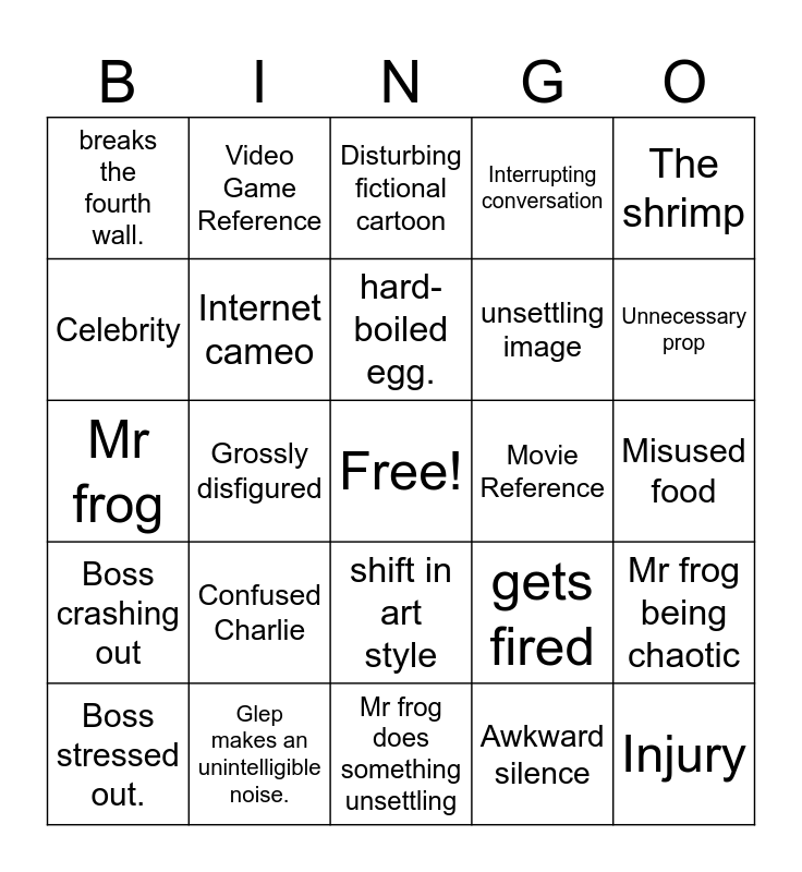 This bingo card has a free space and 24 words: Confused Charlie, Glep makes an unintelligible noise., hard-boiled egg., Boss stressed out., The shrimp, breaks the fourth wall., Celebrity, Video Game Reference, Movie Reference, shift in art style, unsettling image, Mr frog, gets fired, Mr frog being chaotic, Internet cameo, Awkward silence, Misused food, Disturbing fictional cartoon, Unnecessary prop, Grossly disfigured, Injury, Boss crashing out, Interrupting conversation and Mr frog does something unsettling.