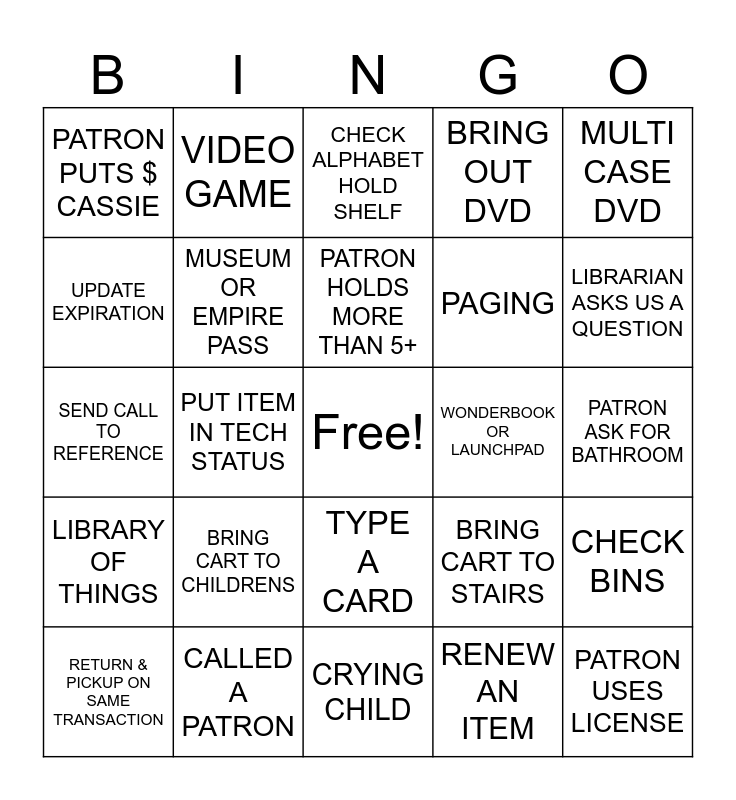 This bingo card has a free space and 24 words: BRING CART TO CHILDRENS, CALLED A PATRON, PATRON HOLDS MORE THAN 5+, RETURN & PICKUP ON SAME TRANSACTION, MULTI CASE DVD, PATRON PUTS $ CASSIE, UPDATE EXPIRATION, VIDEO GAME, WONDERBOOK OR LAUNCHPAD, TYPE A CARD, PAGING, SEND CALL TO REFERENCE, BRING CART TO STAIRS, CHECK BINS, MUSEUM OR EMPIRE PASS, RENEW AN ITEM, PATRON ASK FOR BATHROOM, CHECK ALPHABET HOLD SHELF, LIBRARIAN ASKS US A QUESTION, PUT ITEM IN TECH STATUS, PATRON USES LICENSE, LIBRARY OF THINGS, BRING OUT DVD and CRYING CHILD.