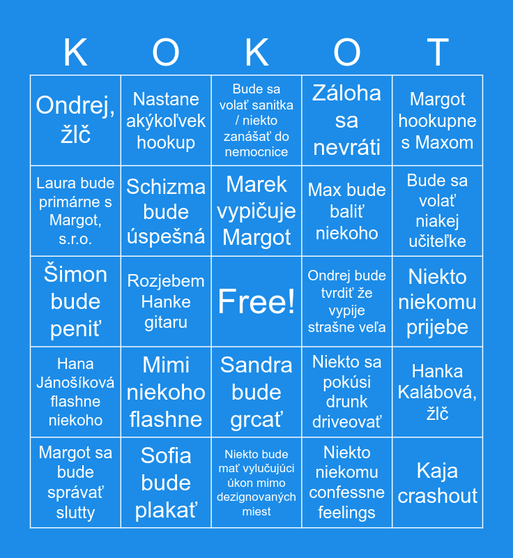 This bingo card has a free space and 24 words: Mimi niekoho flashne, Sofia bude plakať, Marek vypičuje Margot, Margot sa bude správať slutty, Margot hookupne s Maxom, Ondrej, žlč, Laura bude primárne s Margot, s.r.o., Nastane akýkoľvek hookup, Ondrej bude tvrdiť že vypije strašne veľa, Sandra bude grcať, Max bude baliť niekoho, Šimon bude peniť, Niekto sa pokúsi drunk driveovať, Hanka Kalábová, žlč, Schizma bude úspešná, Niekto niekomu confessne feelings, Niekto niekomu prijebe, Bude sa volať sanitka / niekto zanášať do nemocnice, Bude sa volať niakej učiteľke, Rozjebem Hanke gitaru, Kaja crashout, Hana Jánošíková flashne niekoho, Záloha sa nevráti and Niekto bude mať vylučujúci úkon mimo dezignovaných miest.