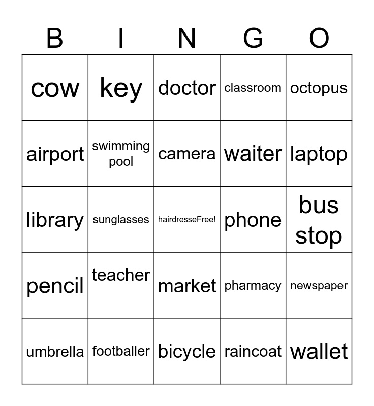 This bingo card has a free space and 24 words: teacher, footballer, camera, umbrella, octopus, cow, airport, key, phone, market, waiter, library, pharmacy, newspaper, swimming pool, raincoat, bus stop, doctor, laptop, sunglasses, wallet, pencil, classroom and bicycle.