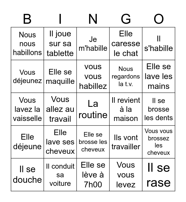 This bingo card has a free space and 29 words: Il se douche, Nous promenons le chien, Vous allez au travail, Il se peigne, Nous nous habillons, Je m'habille, Elle se maquille, Elle lave ses cheveux, Il revient à la maison, Il conduit sa voiture, Il se brosse les dents, Il se rase, Elle se lève à 7h00, Vous vous levez, Elle se lave les mains, Nous allons à l'école, Elle se brosse les cheveux, Elle déjeune, Il s'habille, Vous lavez la vaisselle, Ils vont travailler, Ils se réveillent, Nous regardons la t.v., Vous déjeunez, Elle caresse le chat, Il joue sur sa tablette, Vous vous brossez les cheveux, vous vous habillez and Les enfants déjeunent.