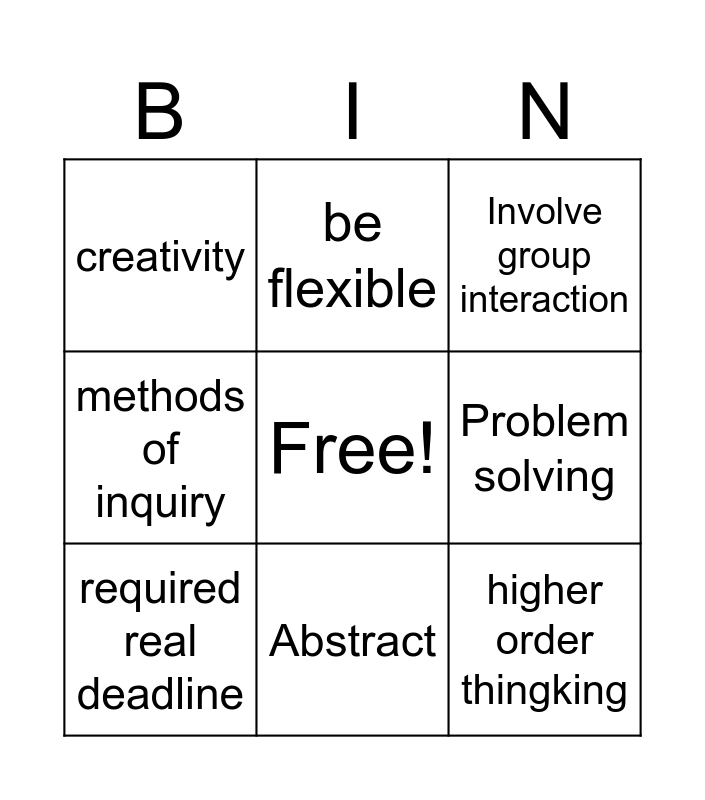 This bingo card has a free space and 10 words: Abstract, Involve group interaction, creativity, higher order thingking, methods of inquiry, required real deadline, be flexible, Problem solving, Problem solving and required real deadline.