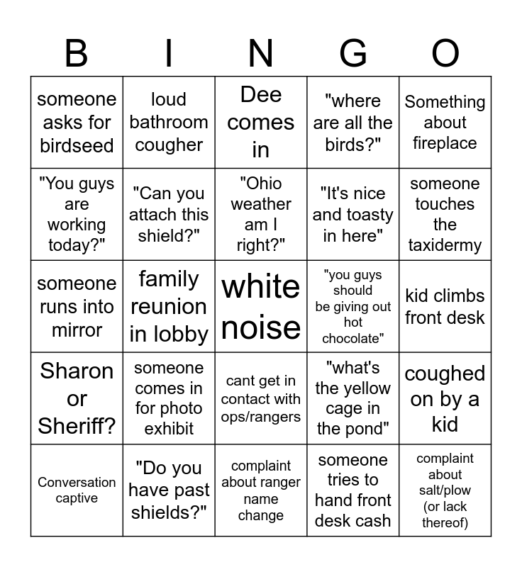 This bingo card has a free space and 59 words: at least one man comes in wearing shorts, "Do you have past shields?", "what happened to the turtle", Sharon or Sheriff?, someone tries to hand front desk cash, "what's with all the sticks?", "Can you attach this shield?", somebody falls/tells us they fell, "It's nice and toasty in here", Inappropriate joke from visitor, "where are all the birds?", poorly behaved "service dog", "You guys are working today?", Denise mention!, joke about walking off the turkey, someone asks for birdseed, complaint about salt/plow (or lack thereof), Something about fireplace, someone crosses desk boundary, "Ohio weather am I right?", "you guys should be giving out hot chocolate", Dee comes in, Conversation captive, coughed on by a kid, someone hits Ross (body checks count), someone Sofia knows comes in, someone Sharon knows calls, break 850, someone touches the taxidermy, kevin being kevin, someone is mean about SLNC on FHS, someone climbs rocks/roof, kid puts entire face in mirror, someone sluuuurrrrrrps water fountain, loud bathroom cougher, child shrieks at hand dryers, out of towner just to do FHS, family reunion in lobby, family gets into argument in center, someone runs into mirror, "fernwood is too hard", someone comes in for photo exhibit, kid climbs front desk, family photo in front of doors, someone asks us to ID a tree, "what's the bird with a dark top and white bottom?", someone thinks we're CVNP, we have to call rangers, cant get in contact with ops/rangers, complaint about ranger name change, mel's hike is either 10+ or less than 3, someone makes Ross uncomfortable, weird smell, someone asks for kevin, "what are those white things around the trees", "what's the yellow cage in the pond", "you guys have beavers?" (beaver fever), someone lost their hiking stick and someone gets hit by a hiking stick.
