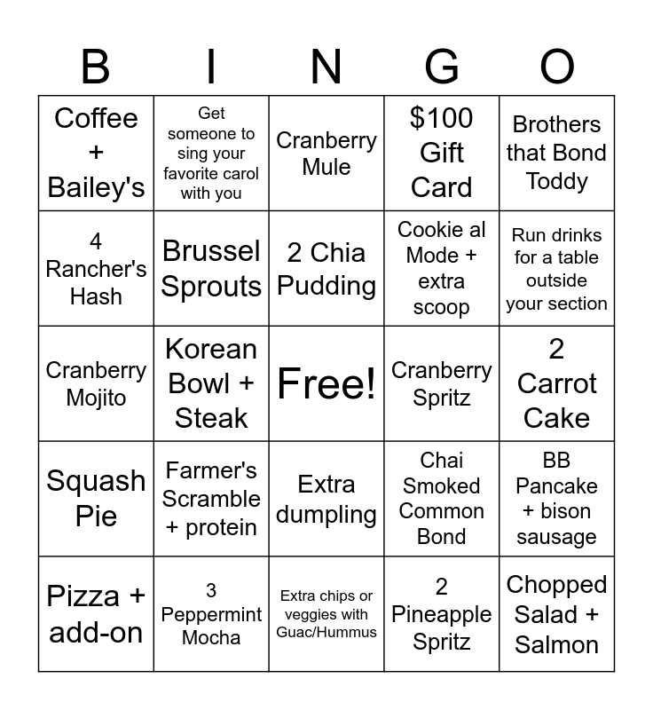 This bingo card has a free space and 24 words: Farmer's Scramble + protein, 3 Peppermint Mocha, 2 Chia Pudding, Pizza + add-on, Brothers that Bond Toddy, Coffee + Bailey's, 4 Rancher's Hash, Get someone to sing your favorite carol with you, Cranberry Spritz, Extra dumpling, Cookie al Mode + extra scoop, Cranberry Mojito, Chai Smoked Common Bond, BB Pancake + bison sausage, Brussel Sprouts, 2 Pineapple Spritz, 2 Carrot Cake, Cranberry Mule, Run drinks for a table outside your section, Korean Bowl + Steak, Chopped Salad + Salmon, Squash Pie, $100 Gift Card and Extra chips or veggies with Guac/Hummus.