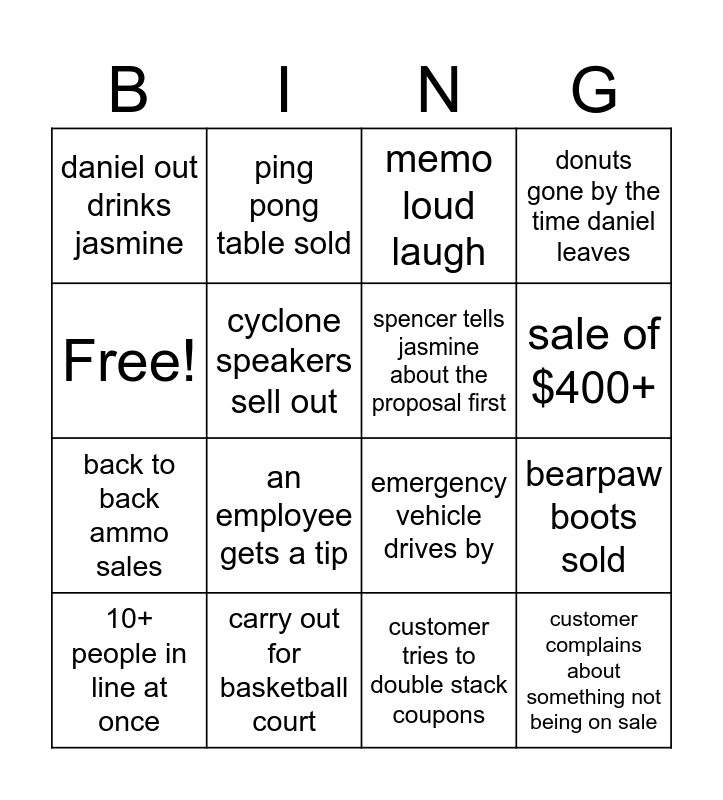 This bingo card has 16 words: carry out for basketball court, bearpaw boots sold, memo loud laugh, daniel out drinks jasmine, back to back ammo sales, ping pong table sold, emergency vehicle drives by, customer tries to double stack coupons, Free!, cyclone speakers sell out, 10+ people in line at once, donuts gone by the time daniel leaves, an employee gets a tip, sale of $400+, spencer tells jasmine about the proposal first and customer complains about something not being on sale.