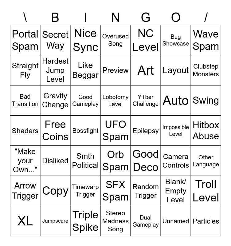 This bingo card has 49 words: Blank/ Empty Level, Layout, Dual Gameplay, Free Coins, Good Gameplay, Hitbox Abuse, Secret Way, Triple Spike, Bug Showcase, Orb Spam, Wave Spam, Overused Song, Auto, YTber Challenge, Copy, Impossible Level, Straight Fly, Clubstep Monsters, Troll Level, NC Level, Art, Bossfight, Portal Spam, Hardest Jump Level, XL, Like Beggar, Swing, Jumpscare, Lobotomy Level, Gravity Change, Particles, Epilepsy, Arrow Trigger, Timewarp Trigger, Shaders, Good Deco, Camera Controls, Other Language, Bad Transition, Smth Political, SFX Spam, "Make your Own...", UFO Spam, Stereo Madness Song, Preview, Nice Sync, Random Trigger, Disliked and Unnamed.