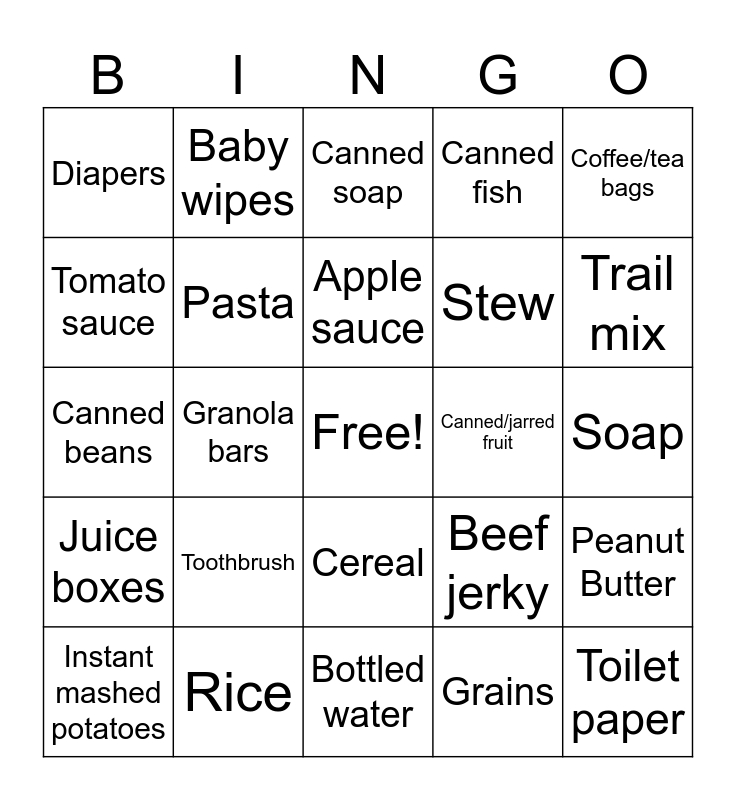 This bingo card has a free space and 40 words: Canned corn, Canned beans, Baby formula, Pasta, Rice, Cereal, Apple sauce, Baby food, Coffee/tea bags, Juice boxes, Granola bars, Canned fish, Toilet paper, Soap, Canned/jarred fruit, Toothbrush, Tooth paste, Diapers, Oats, Canned soap, Peanut Butter, Grains, Stew, Tomato sauce, Fruit cups, Menstrual products, Powdered milk, Cooking oil, Crackers, Nuts, Ramen noodles, Instant mashed potatoes, Jams/Jellies, Beef jerky, Trail mix, Bottled water, Condiments, Shampoo/body wash, Baby wipes and Puddings.