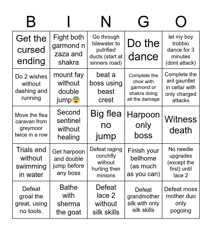 This bingo card has a free space and 24 words: Get harpoon and double jump before any boss, Bathe with sherma the goat, beat a boss using beast crest, Defeat groal the great, using no tools., let my boy trobbio dance for 3 minutes (dont attack), Get the cursed ending, Do 2 wishes without dashing and running, Fight both garmond n zaza and shakra, Harpoon only boss, Defeat raging conchfly without hurting their minions, Complete the choir with garmond or shakra doing all the damage, Move the flea caravan from greymoor twice in a row, Finish your bellhome (as much as you can), No needle upgrades (except the first) until lace 2, mount fay without double jump😨, Defeat grandmother silk with only silk skills, Witness death, Go through bilewater to putrified ducts (start at sinners road), Complete the ant gauntlet in cellar with only charged attacks, Second sentinel without healing, Defeat moss mother duo only pogoing, Trials end without swimming in water, Do the dance and Defeat lace 2 without silk skills.