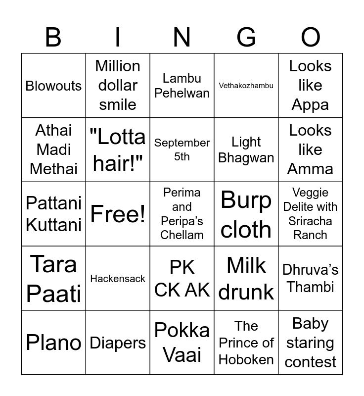 This bingo card has 42 words: 12 weeks old, September 5th, 9:04 PM, Hackensack, The Prince of Hoboken, Dhruva’s Thambi, Perima and Peripa’s Chellam, Kozhandaikku Pasikarthu, Lambu Pehelwan, PK CK AK, Veggie Delite with Sriracha Ranch, Looks like Amma, Free!, Looks like Appa, Tummy time, Milk drunk, Kunjappane Appan, Pattani Kuttani, Daga daga daga daga, Million dollar smile, Athai Madi Methai, Face scratches, Baby staring contest, Blowouts, 2 sneezes in a row, Meow, Light Bhagwan, Dosai with extra Molagapodi, Sita Ammama, Ravi Thatha, Narayanan Thatha, Tara Paati, "Lotta hair!", Pokka Vaai, Bangalore, Plano, Diapers, Burp cloth, Diaper Pail, Footed Onesie, Vethakozhambu and Baby dance.