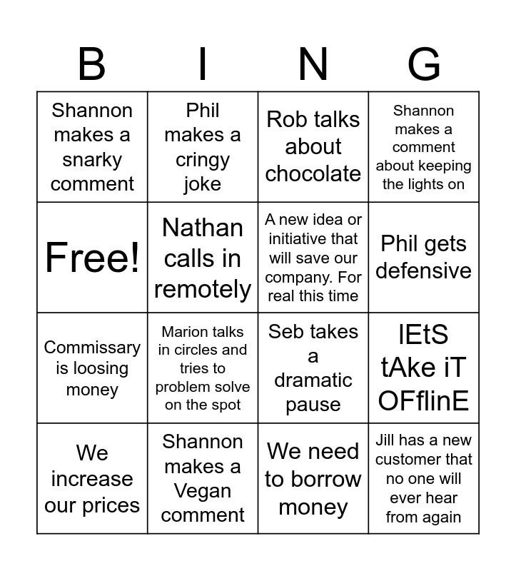 This bingo card has 16 words: Shannon makes a Vegan comment, lEtS tAke iT OFflinE, Rob talks about chocolate, Shannon makes a snarky comment, Commissary is loosing money, Phil makes a cringy joke, Seb takes a dramatic pause, We need to borrow money, Free!, Nathan calls in remotely, We increase our prices, Shannon makes a comment about keeping the lights on, Marion talks in circles and tries to problem solve on the spot, Phil gets defensive, A new idea or initiative that will save our company. For real this time and Jill has a new customer that no one will ever hear from again.