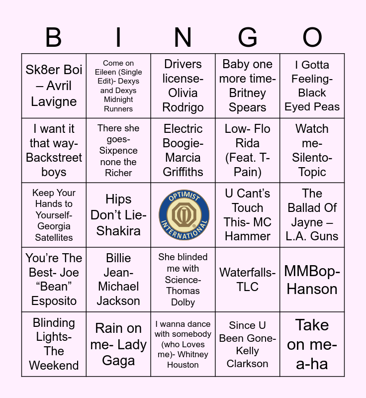 This bingo card has a free space and 51 words: Tom Petty- Free Fallin, Take on me- a-ha, Every breath you take- the Police, I wanna dance with somebody (who Loves me)- Whitney Houston, Billie Jean- Michael Jackson, Should I stay or should I go (remastered)- The clash, Come on Eileen (Single Edit)- Dexys and Dexys Midnight Runners, Time After Time- Cyndi Lauper, I want it that way- Backstreet boys, Always be my baby- Mariah Carey, There she goes- Sixpence none the Richer, Baby one more time- Britney Spears, MMBop- Hanson, Waterfalls- TLC, Bye Bye Bye- NSYNC, Gettin’ Jiggy Wit It – Will Smith, Electric Boogie- Marcia Griffiths, U Cant’s Touch This- MC Hammer, Single Ladies- Beyonce, I Gotta Feeling- Black Eyed Peas, Hips Don’t Lie- Shakira, Since U Been Gone- Kelly Clarkson, Sk8er Boi – Avril Lavigne, Low- Flo Rida (Feat. T-Pain), Umbrella- Rihanna, Crazy in Love- Beyonce, Watch me- Silento- Topic, Old Town Road- Lil Nas X, Blinding Lights- The Weekend, Drivers license- Olivia Rodrigo, Dance Monkey- Tones and I, Iko Iko- Justin Wellington, Dynamite- Bangtantv, Feel it still – Portugal. The Man, Intentions- Justin Bieber, Rain on me- Lady Gaga, Havana- Camila Cabello, No Excuses- Meghan Trainor, Say my name- Destiny’s Child, Break My Stride- Matthew Wilder, The Ballad Of Jayne – L.A. Guns, You’re The Best- Joe “Bean” Esposito, Black Velvet- Alannah Myles, Pass The Dutchie- Musical Youth, Missing You- John Waite- Topic, Voices Carry- ‘Til Tuesday- Topic, Keep Your Hands to Yourself- Georgia Satellites, Obsession- Animotion, We don’t have to take our clothes off- Jermaine Stewart, She blinded me with Science- Thomas Dolby and Edge of broken heart- Vixen.