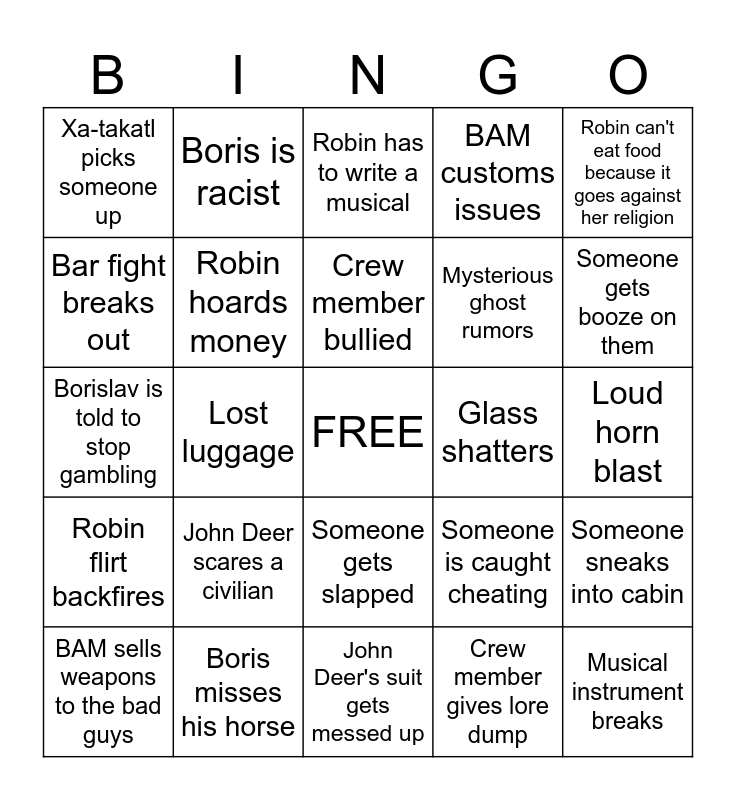 This bingo card has a free space and 24 words: John Deer scares a civilian, Boris misses his horse, Crew member bullied, BAM sells weapons to the bad guys, Robin can't eat food because it goes against her religion, Xa-takatl picks someone up, Bar fight breaks out, Boris is racist, Glass shatters, Someone gets slapped, Mysterious ghost rumors, Borislav is told to stop gambling, Someone is caught cheating, Someone sneaks into cabin, Robin hoards money, Crew member gives lore dump, Loud horn blast, Robin has to write a musical, Someone gets booze on them, Lost luggage, Musical instrument breaks, Robin flirt backfires, BAM customs issues and John Deer's suit gets messed up.