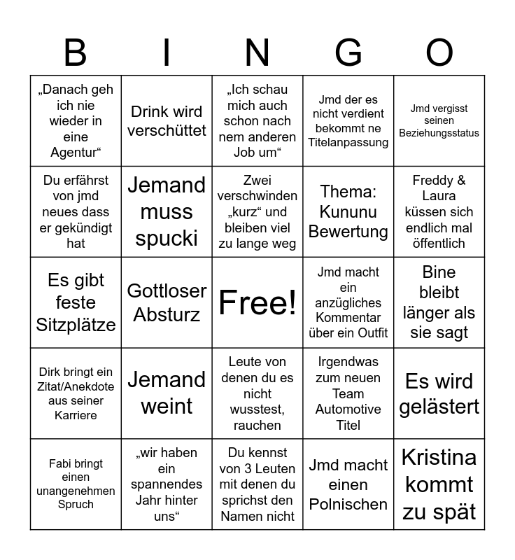 This bingo card has a free space and 24 words: Jemand weint, „wir haben ein spannendes Jahr hinter uns“, Zwei verschwinden „kurz“ und bleiben viel zu lange weg, Fabi bringt einen unangenehmen Spruch, Jmd vergisst seinen Beziehungsstatus, „Danach geh ich nie wieder in eine Agentur“, Du erfährst von jmd neues dass er gekündigt hat, Drink wird verschüttet, Jmd macht ein anzügliches Kommentar über ein Outfit, Leute von denen du es nicht wusstest, rauchen, Thema: Kununu Bewertung, Es gibt feste Sitzplätze, Irgendwas zum neuen Team Automotive Titel, Es wird gelästert, Jemand muss spucki, Jmd macht einen Polnischen, Bine bleibt länger als sie sagt, „Ich schau mich auch schon nach nem anderen Job um“, Freddy & Laura küssen sich endlich mal öffentlich, Gottloser Absturz, Kristina kommt zu spät, Dirk bringt ein Zitat/Anekdote aus seiner Karriere, Jmd der es nicht verdient bekommt ne Titelanpassung and Du kennst von 3 Leuten mit denen du sprichst den Namen nicht.