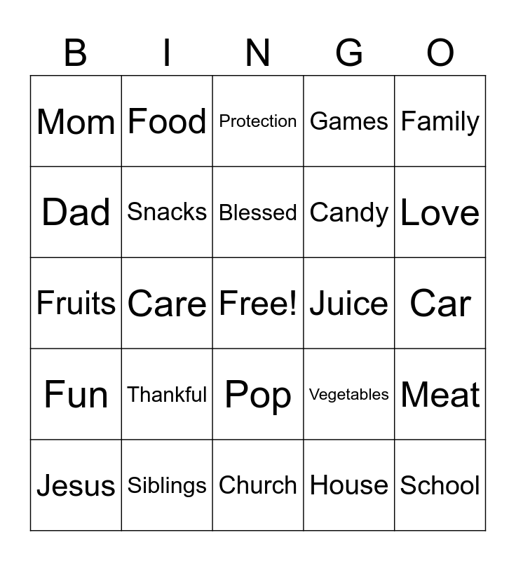 This bingo card has a free space and 24 words: Thankful, Siblings, Blessed, Jesus, Family, Mom, Dad, Food, Juice, Pop, Candy, Fruits, Vegetables, Meat, Snacks, House, Car, Protection, Love, Care, School, Fun, Games and Church.