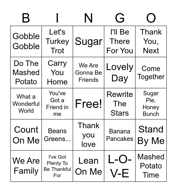 This bingo card has a free space and 24 words: Beans Greens..., I've Got Plenty To Be Thankful For, We Are Gonna Be Friends, We Are Family, Thank You, Next, Gobble Gobble, Do The Mashed Potato, Let's Turkey Trot, Rewrite The Stars, Thank you love, Lovely Day, What a Wonderful World, Banana Pancakes, Stand By Me, Carry You Home, L-O-V-E, Sugar Pie, Honey Bunch, Sugar, Come Together, You've Got a Friend in me, Mashed Potato Time, Count On Me, I'll Be There For You and Lean On Me.
