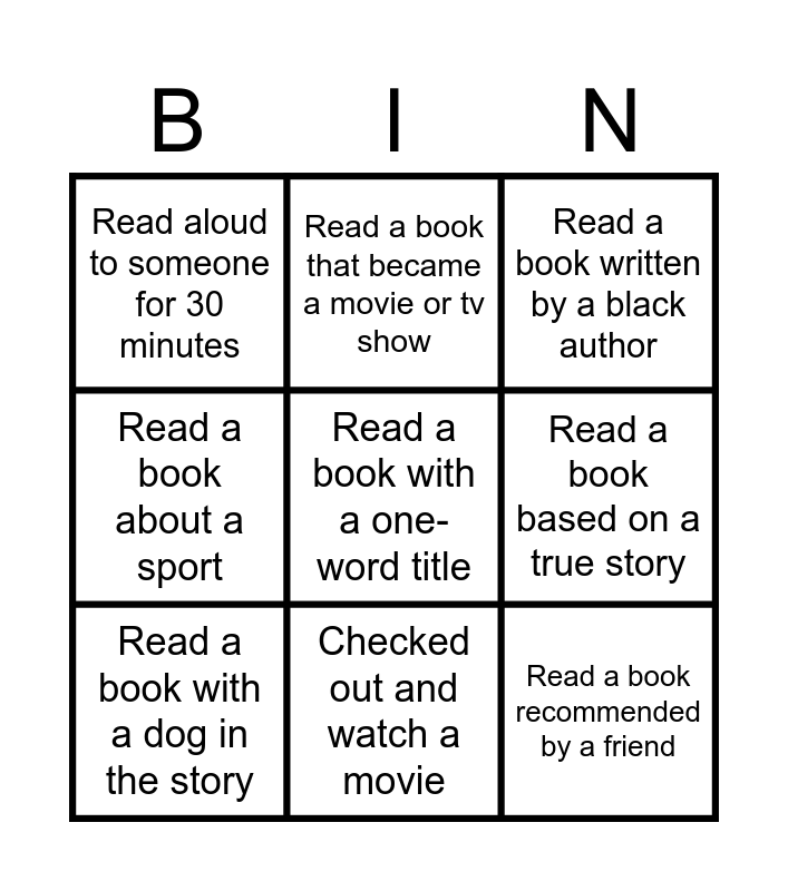 This bingo card has 23 words: Checked out a cookbook and tried a recipe, Read a mystery book, Checked out and watch a movie, Reread a book you love, Read a book with a one-word title, Read aloud to someone for 30 minutes, Read a book based on a true story, Read a book that became a movie or tv show, Read a nonfiction book, Read a book with a color in the title, Read a book written over 20 years ago, Read a book recommended by a friend, Read a book you randomly choose off the shelf, Read a book set in a different country, Read a book that takes place on/in/or under water, Read a book with a cat in the story, Read a book written by a black author, Read a book by a Native American author, Read a book with a dog in the story, Read a book that takes place in/on another world, Read a book about a sport, Read a book by an LGBTQIA2S+ author and Read a book that takes place in space.