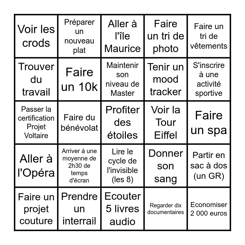 This bingo card has a free space and 24 words: Arriver à une moyenne de 2h30 de temps d'écran, Prendre un interrail, Maintenir son niveau de Master, Faire un projet couture, Faire un tri de vêtements, Voir les crods, Trouver du travail, Préparer un nouveau plat, Voir la Tour Eiffel, Lire le cycle de l'invisible (les 8), Tenir un mood tracker, Passer la certification Projet Voltaire, Donner son sang, Partir en sac à dos (un GR), Faire un 10k, Regarder dix documentaires, Faire un spa, Aller à l'île Maurice, S'inscrire à une activité sportive, Faire du bénévolat, Economiser 2 000 euros, Aller à l'Opéra, Faire un tri de photo and Ecouter 5 livres audio.