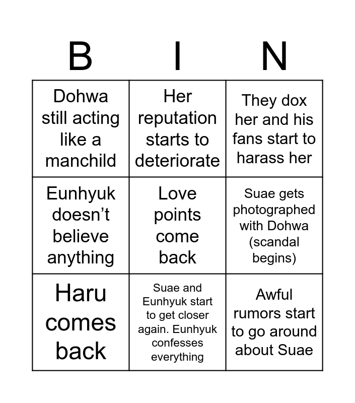 This bingo card has a free space and 8 words: Suae gets photographed with Dohwa (scandal begins), They dox her and his fans start to harass her, Her reputation starts to deteriorate, Haru comes back, Dohwa still acting like a manchild, Awful rumors start to go around about Suae, Eunhyuk doesn’t believe anything and Suae and Eunhyuk start to get closer again. Eunhyuk confesses everything.