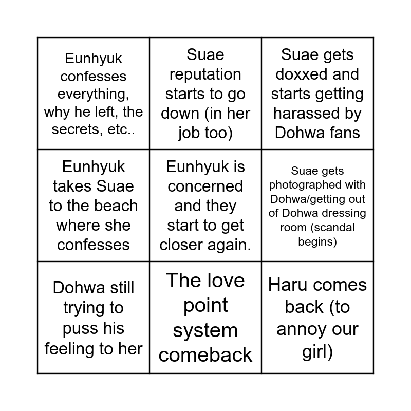 This bingo card has a free space and 8 words: Suae gets photographed with Dohwa/getting out of Dohwa dressing room (scandal begins), Suae gets doxxed and starts getting harassed by Dohwa fans, Suae reputation starts to go down (in her job too), Dohwa still trying to puss his feeling to her, Eunhyuk confesses everything, why he left, the secrets, etc.., Haru comes back (to annoy our girl), Eunhyuk takes Suae to the beach where she confesses and The love point system comeback.