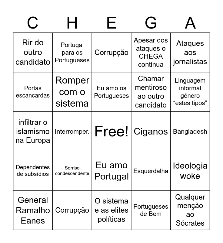 This bingo card has a free space and 24 words: Sorriso condescendente, Corrupção, Eu amo os Portugueses, General Ramalho Eanes, Ataques aos jornalistas, Rir do outro candidato, Portas escancardas, Portugal para os Portugueses, Ciganos, Eu amo Portugal, Chamar mentiroso ao outro candidato, infiltrar o islamismo na Europa, Esquerdalha, Ideologia woke, Romper com o sistema, Portugueses de Bem, Bangladesh, Corrupção, Linguagem informal género “estes tipos”, Interromper., Qualquer menção ao Sócrates, Dependentes de subsídios, Apesar dos ataques o CHEGA continua and O sistema e as elites políticas.