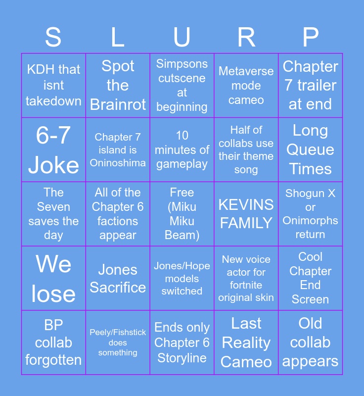 This bingo card has a free space and 24 words: Jones Sacrifice, Peely/Fishstick does something, 10 minutes of gameplay, BP collab forgotten, Chapter 7 trailer at end, KDH that isnt takedown, 6-7 Joke, Spot the Brainrot, KEVINS FAMILY, Jones/Hope models switched, Half of collabs use their theme song, The Seven saves the day, New voice actor for fortnite original skin, Cool Chapter End Screen, Chapter 7 island is Oninoshima, Last Reality Cameo, Shogun X or Onimorphs return, Simpsons cutscene at beginning, Long Queue Times, All of the Chapter 6 factions appear, Old collab appears, We lose, Metaverse mode cameo and Ends only Chapter 6 Storyline.