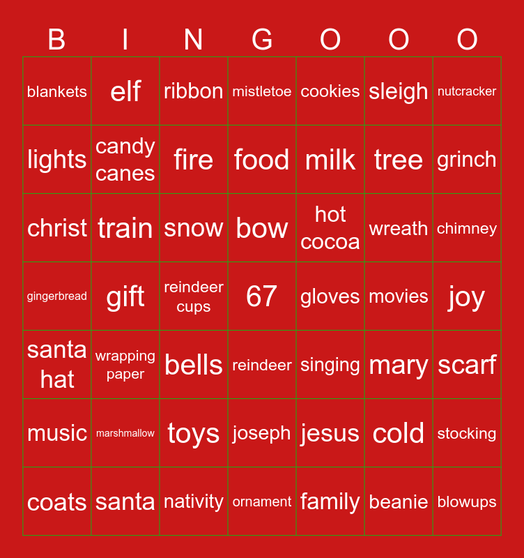 This bingo card has a free space and 48 words: jesus, tree, ornament, gift, snow, joy, elf, santa, sleigh, reindeer, nutcracker, mistletoe, wreath, hot cocoa, music, movies, lights, grinch, cold, cookies, milk, reindeer cups, blankets, candy canes, stocking, fire, chimney, coats, bow, train, beanie, gloves, scarf, marshmallow, gingerbread, singing, mary, christ, bells, toys, santa hat, blowups, ribbon, nativity, food, joseph, wrapping paper and family.