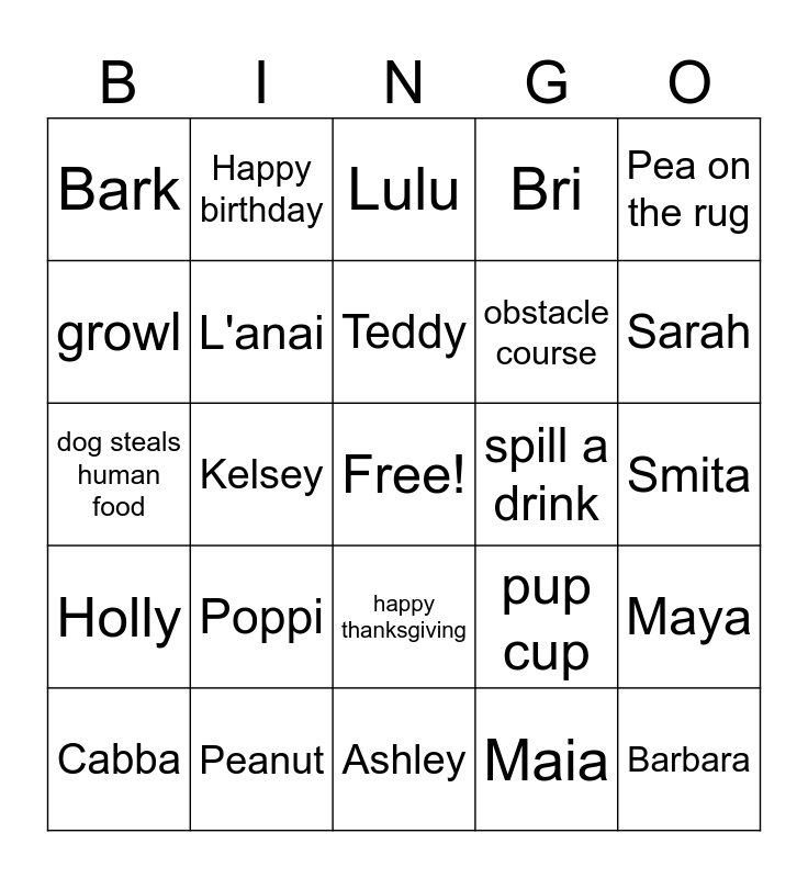 This bingo card has a free space and 24 words: Poppi, Peanut, Teddy, Cabba, Pea on the rug, Bark, growl, Happy birthday, spill a drink, happy thanksgiving, obstacle course, dog steals human food, pup cup, Maya, L'anai, Maia, Smita, Lulu, Sarah, Kelsey, Barbara, Holly, Bri and Ashley.