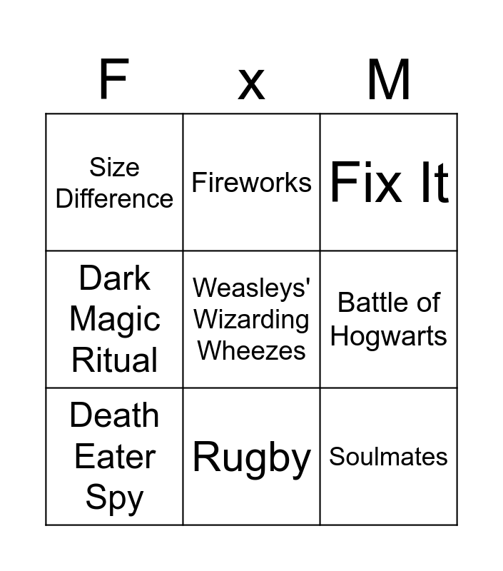 This bingo card has 15 words: Niffler, Quidditch, Fix It, Size Difference, Rugby, Weasleys' Wizarding Wheezes, Second Chance Romance, Childhood Romance, Battle of Hogwarts, Soulmates, Secret Relationship, Dark Magic Ritual, Death Eater Spy, Fireworks and Eighth Year.