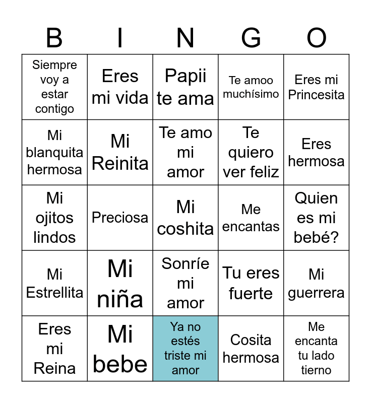 This bingo card has a free space and 24 words: Mi niña, Mi bebe, Te amo mi amor, Eres mi Reina, Eres mi Princesita, Siempre voy a estar contigo, Mi blanquita hermosa, Eres mi vida, Me encantas, Sonríe mi amor, Te quiero ver feliz, Mi ojitos lindos, Tu eres fuerte, Mi guerrera, Mi Reinita, Cosita hermosa, Quien es mi bebé?, Papii te ama, Eres hermosa, Preciosa, Me encanta tu lado tierno, Mi Estrellita, Te amoo muchísimo and Ya no estés triste mi amor.
