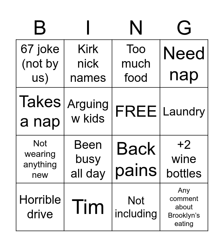 This bingo card has 16 words: Horrible drive, Tim, Too much food, Need nap, Takes a nap, Kirk nick names, Back pains, +2 wine bottles, 67 joke (not by us), Arguing w kids, Not including, Laundry, Not wearing anything new, Been busy all day, FREE and Any comment about Brooklyn’s eating.