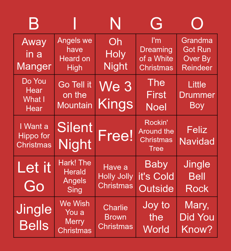 This bingo card has a free space and 29 words: Jingle Bells, Oh Christmas Tree, Silent Night, Rudolph the Red Nose Reindeer, Away in a Manger, Oh Holy Night, Go Tell it on the Mountain, Hark! The Herald Angels Sing, Rockin' Around the Christmas Tree, We Wish You a Merry Christmas, Feliz Navidad, Mary, Did You Know?, Charlie Brown Christmas, Joy to the World, Little Drummer Boy, Christmas Eve/Sarajevo, Have a Holly Jolly Christmas, Let it Go, Grandma Got Run Over By Reindeer, I Want a Hippo for Christmas, Baby it's Cold Outside, Let it Snow, The First Noel, Do You Hear What I Hear, I'm Dreaming of a White Christmas, Angels we have Heard on High, Jingle Bell Rock, We 3 Kings and Frosty, the Snowman.