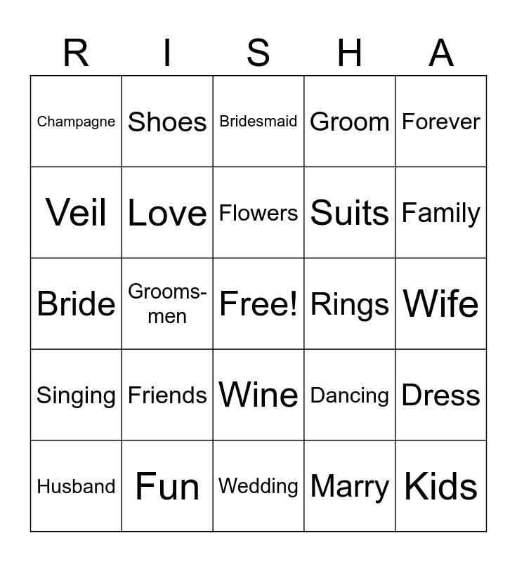 This bingo card has a free space and 24 words: Friends, Fun, Flowers, Husband, Forever, Champagne, Veil, Shoes, Rings, Wine, Suits, Bride, Dancing, Dress, Love, Marry, Wife, Bridesmaid, Family, Grooms-men, Kids, Singing, Groom and Wedding.