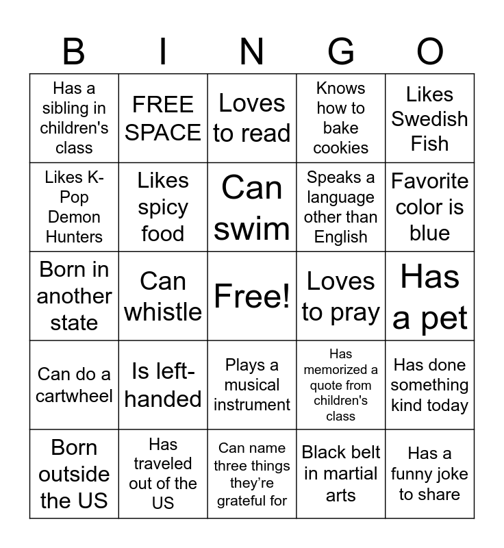 This bingo card has a free space and 24 words: Is left-handed, Has traveled out of the US, Can swim, Born outside the US, Likes Swedish Fish, Has a sibling in children's class, Likes K-Pop Demon Hunters, FREE SPACE, Loves to pray, Plays a musical instrument, Speaks a language other than English, Born in another state, Has memorized a quote from children's class, Has done something kind today, Likes spicy food, Black belt in martial arts, Has a pet, Loves to read, Favorite color is blue, Can whistle, Has a funny joke to share, Can do a cartwheel, Knows how to bake cookies and Can name three things they’re grateful for.