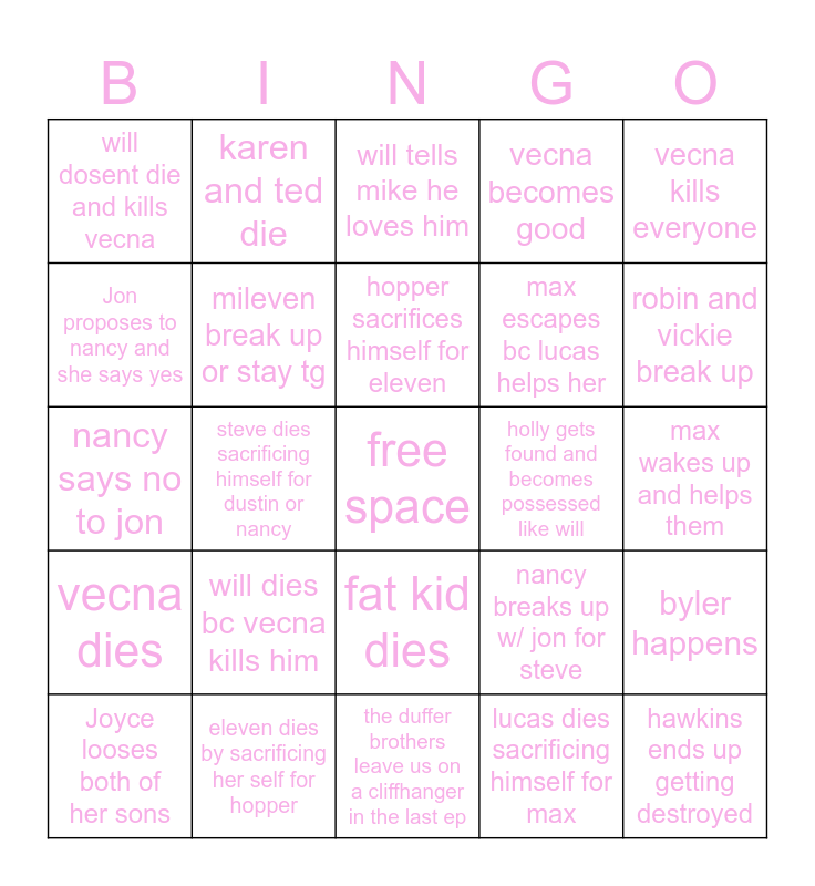 This bingo card has a free space and 24 words: will dies bc vecna kills him, eleven dies by sacrificing her self for hopper, hopper sacrifices himself for eleven, Joyce looses both of her sons, vecna kills everyone, will dosent die and kills vecna, Jon proposes to nancy and she says yes, karen and ted die, holly gets found and becomes possessed like will, fat kid dies, max escapes bc lucas helps her, nancy says no to jon, nancy breaks up w/ jon for steve, byler happens, mileven break up or stay tg, lucas dies sacrificing himself for max, max wakes up and helps them, will tells mike he loves him, robin and vickie break up, steve dies sacrificing himself for dustin or nancy, hawkins ends up getting destroyed, vecna dies, vecna becomes good and the duffer brothers leave us on a cliffhanger in the last ep.