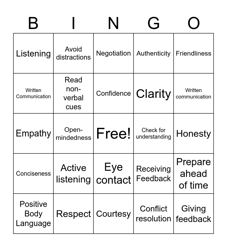 This bingo card has a free space and 24 words: Active listening, Respect, Confidence, Positive Body Language, Friendliness, Listening, Written Communication, Avoid distractions, Check for understanding, Eye contact, Clarity, Empathy, Receiving Feedback, Prepare ahead of time, Read non-verbal cues, Conflict resolution, Honesty, Negotiation, Written communication, Open-mindedness, Giving feedback, Conciseness, Authenticity and Courtesy.
