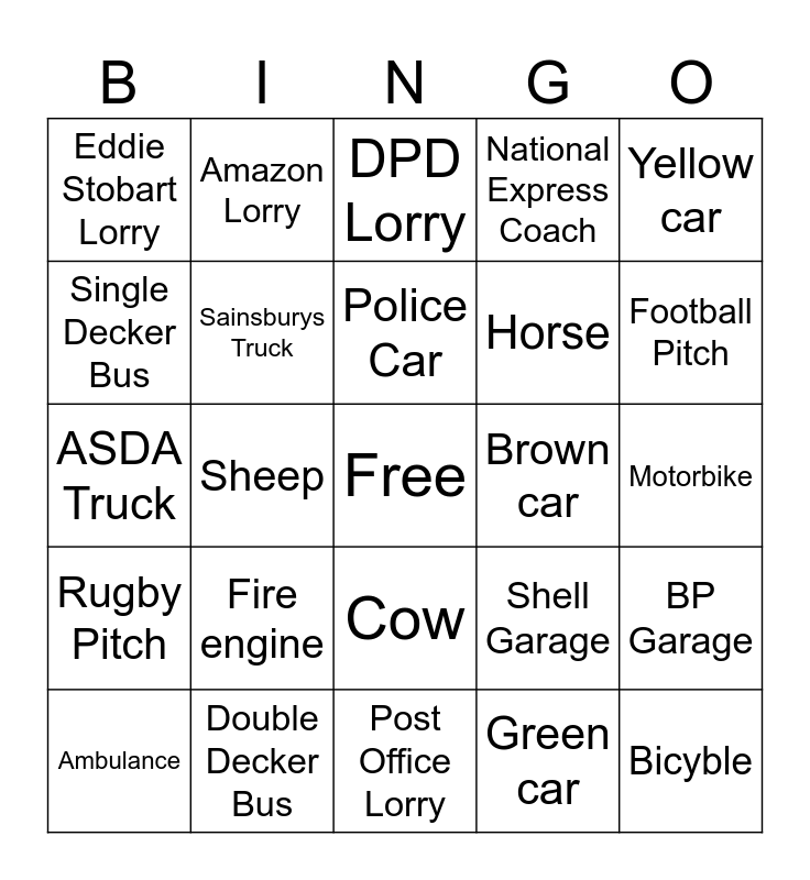 This bingo card has a free space and 24 words: Ambulance, Fire engine, Police Car, Green car, Yellow car, Eddie Stobart Lorry, Amazon Lorry, DPD Lorry, Brown car, Motorbike, ASDA Truck, Sainsburys Truck, Shell Garage, BP Garage, Single Decker Bus, Double Decker Bus, Post Office Lorry, National Express Coach, Football Pitch, Rugby Pitch, Sheep, Cow, Horse and Bicyble.