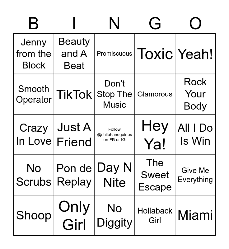 This bingo card has a free space and 28 words: Give Me Everything, Genie In A Bottle, Glamorous, Hollaback Girl, Smooth Operator, Promiscuous, Beauty and A Beat, No Scrubs, Hey Ya!, Shoop, Crazy In Love, Toxic, Only Girl, No Diggity, Rock Your Body, Wannabe, Pon de Replay, TikTok, Don’t Stop The Music, Day N Nite, Jenny from the Block, Hot in Herre, Miami, Just A Friend, All I Do Is Win, The Sweet Escape, Yeah! and Pocketful of Sunshine.