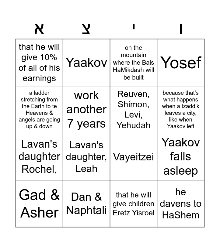 This bingo card has 19 words: Vayeitzei, he leaves Beersheva to Charan, on the mountain where the Bais HaMikdash will be built, he davens to HaShem, Yaakov falls asleep, a ladder stretching from the Earth to te Heavens & angels are going up & down, that he will give children Eretz Yisroel, that he will give 10% of all of his earnings, Yaakov, Lavan's daughter Rochel,, Lavan's daughter, Leah, work another 7 years, Reuven, Shimon, Levi, Yehudah, Dan & Naphtali, Gad & Asher, Yissachar, Zevulun & Dinah, Yosef, because that's what happens when a tzaddik leaves a city, like when Yaakov left and with his walking stick, the same one split the Jordan & the Yam Suf.