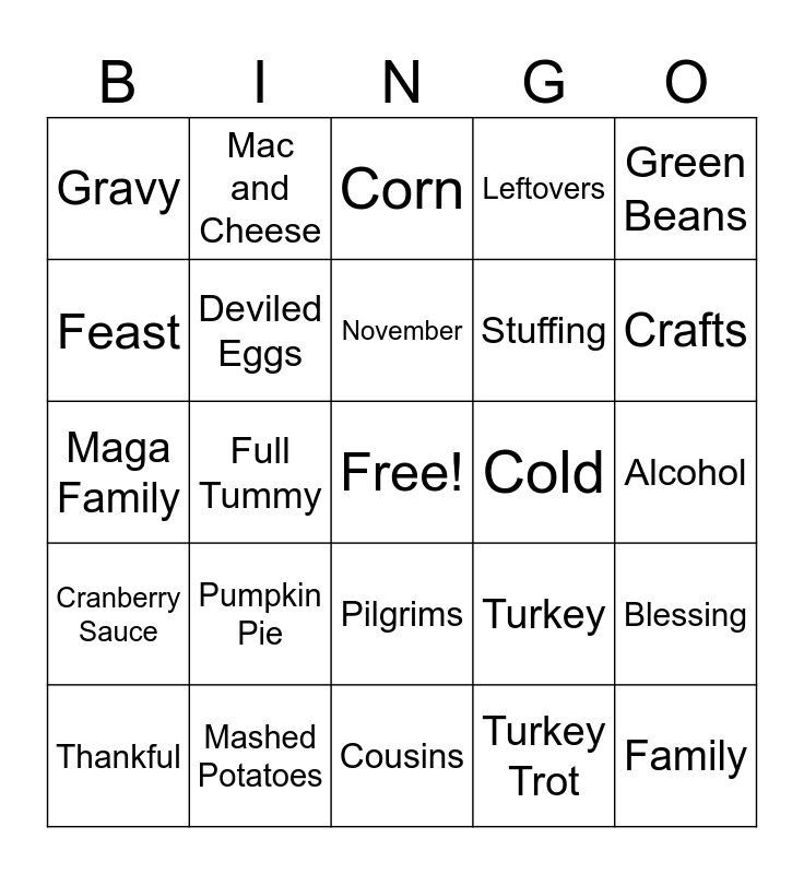 This bingo card has a free space and 30 words: Mashed Potatoes, Macy's Thanksgiving Parade, Full Tummy, Post Thanksgiving Nap, Gravy, Corn, Deviled Eggs, Pilgrims, Cold, Cousins, Alcohol, Family, Turkey Trot, Stranger Things Release, Crafts, Gratitude, Turkey, Cranberry Sauce, Pumpkin Pie, Green Beans, Maga Family, Football, Mac and Cheese, Stuffing, Feast, Leftovers, Blessing, Thankful, November and Fall.