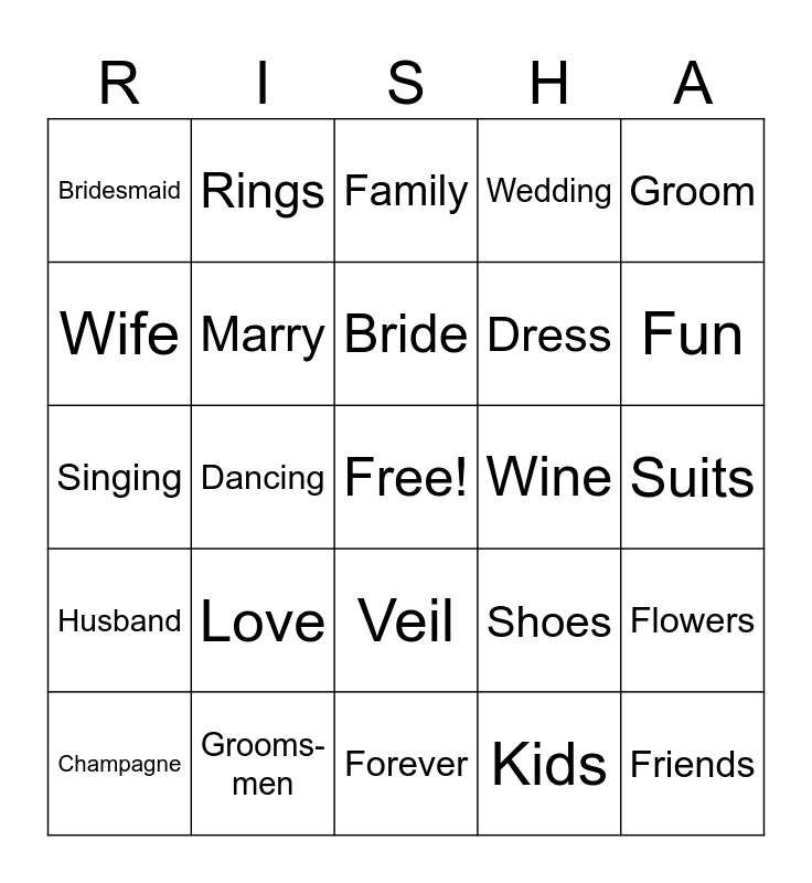 This bingo card has a free space and 24 words: Love, Grooms-men, Bride, Champagne, Groom, Bridesmaid, Wife, Rings, Wine, Veil, Dress, Singing, Shoes, Flowers, Marry, Kids, Suits, Family, Fun, Dancing, Friends, Husband, Wedding and Forever.
