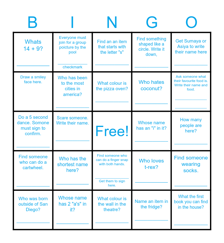 This bingo card has a free space and 24 words: Who was born outside of San Diego? _____________, Who has the shortest name here? ____________, What colour is the pizza oven? _____________, Name an item in the fridge? _____________, Get Sumaya or Asiya to write their name here _____________, Whats 14 + 9? __________, Everyone must join for a group poicture by the pool _____________ checkmark, Find an an item that starts with the letter "s" ______________, Whose name has an "i" in it? _____________, How many people are here? _____________, Do a 5 second dance. Somone must sign to confirm. _____________, Who has been to the most cities in america? _____________, Who loves t-rex? ___________, Find someone wearing socks. ___________, Draw a smiley face here., Whose name has 2 "a's" in it? ____________, What colour is the wall in the theatre? _____________, Find something shaped like a circle. Write it down, ______________, Ask someone what their favourite food is. Write their name and food. ________________ ________________, Find someone who can do a cartwheel. _____________, Scare someone. Write their name. ______________, Find someone who can do a finger snap with both hands. _________________ Get them to sign here., Who hates coconut? ___________ and What the first book you can find in the house? ______________.